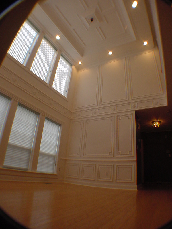 A picture is worth a thousand feet of mouldings! We took a simple room with high ceilings and 1 floor lamp and let our imagination run wild. From the floor to the ceiling, nothing was left untouched. Starting with a bold 2 piece base trim, double shadow boxes, a chair rail, shadow boxes with an inlay, a decorative pattern that is symmetrical around the entire perimeter of the room and then grand double shadow boxes. All that topped off with a tray ceiling that has 5 seperate layers of trim and crown mouldings to transition up to the original ceiling. New recessed lights and a custom made chandelier (not pictured) on an electric winch light this room up!