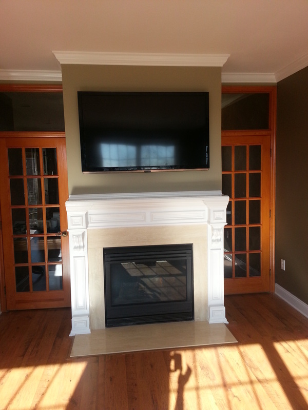 Wyckoff, NJ - Fireplace Home TheaterA new custom built fireplace mantle and a new flatscreen TV makes this the center of attention in this room. Flush wall speakers installed around the room for a full surround sound with hidden theater components on an extended infared sensor. A new chair rail and shadow boxes finishes this room.