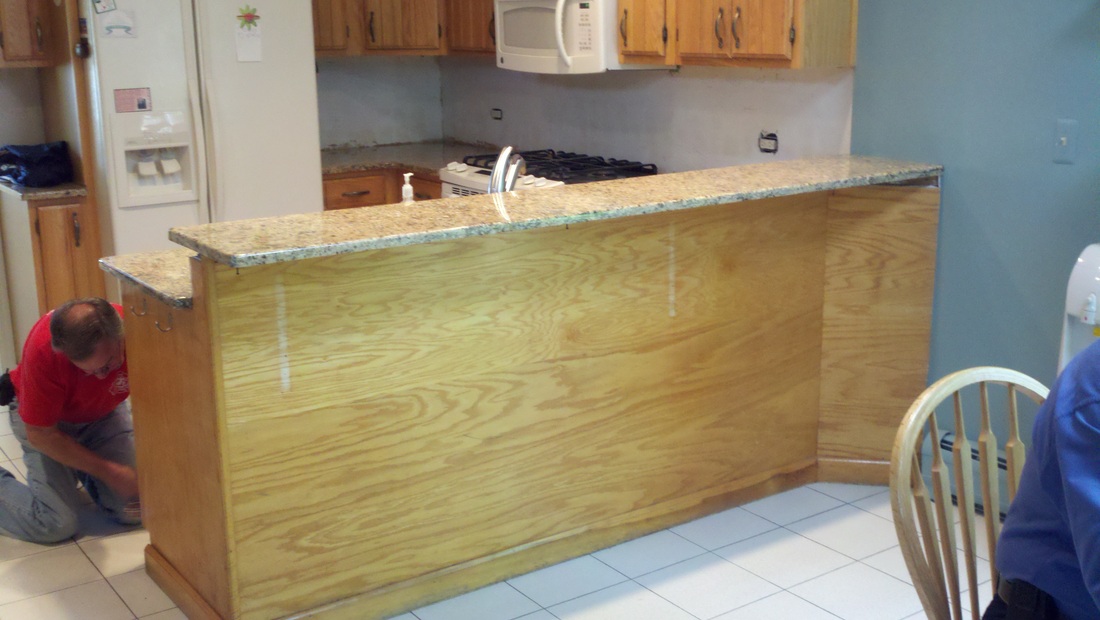 An modern kitchen with some old woodwork gets a new look. We added some simple shadow boxes on the breakfast bar with a bold corner and some new tile on the backsplash. The breakfast bar gets a new coat of paint later by the homeowner.